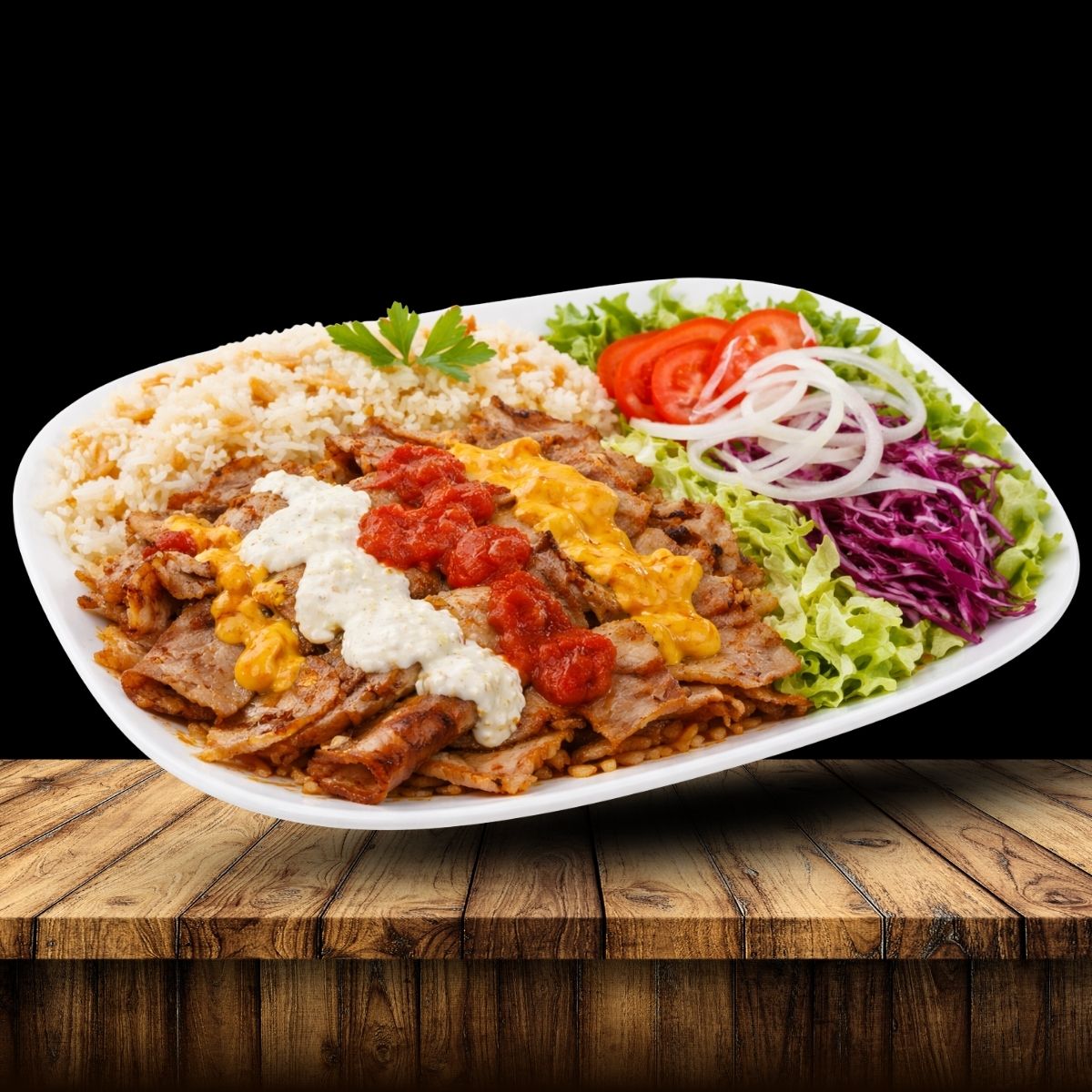 Auf dem Teller mit Pommes oder Reis, Salat